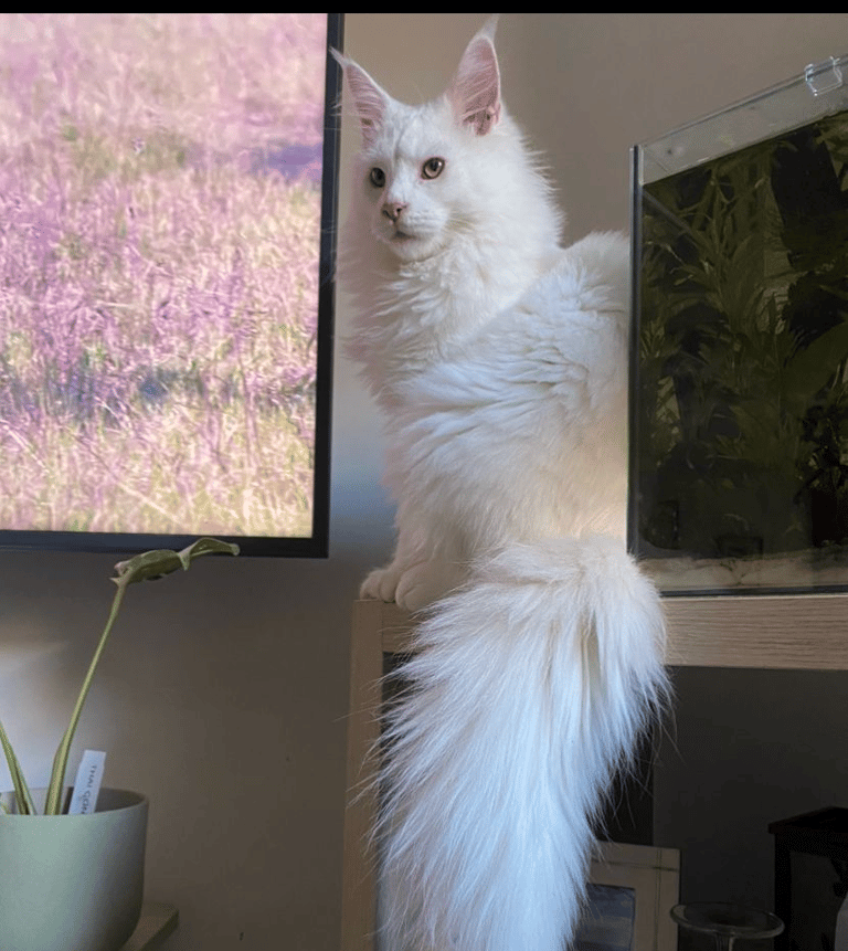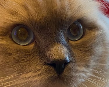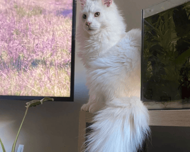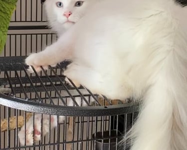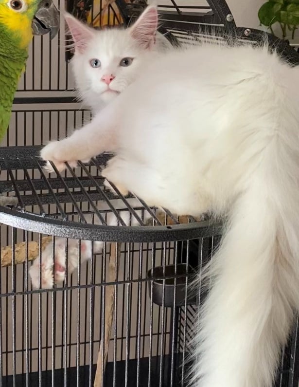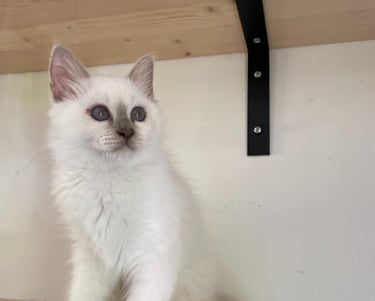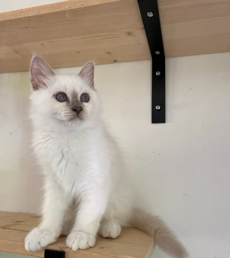 Blanc comme neige, comme son papa Hiro, mais avec de magnifiques yeux bleus ! Impossible de le laisser partir de la maison. Mon fils a lié un lien très fort avec cette boule de ronrons et de câlins.